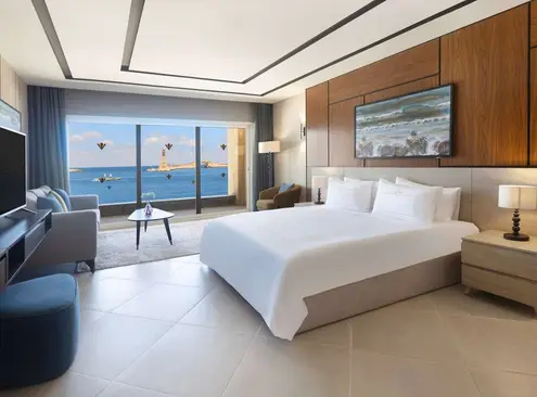 The resort features luxurious rooms and suites with refined interiors, private balconies, and breathtaking views of the Mediterranean Sea or the Montaza Palace gardens. Each accommodation is equipped with premium amenities, delivering comfort and sophistication for both leisure and luxury travelers.